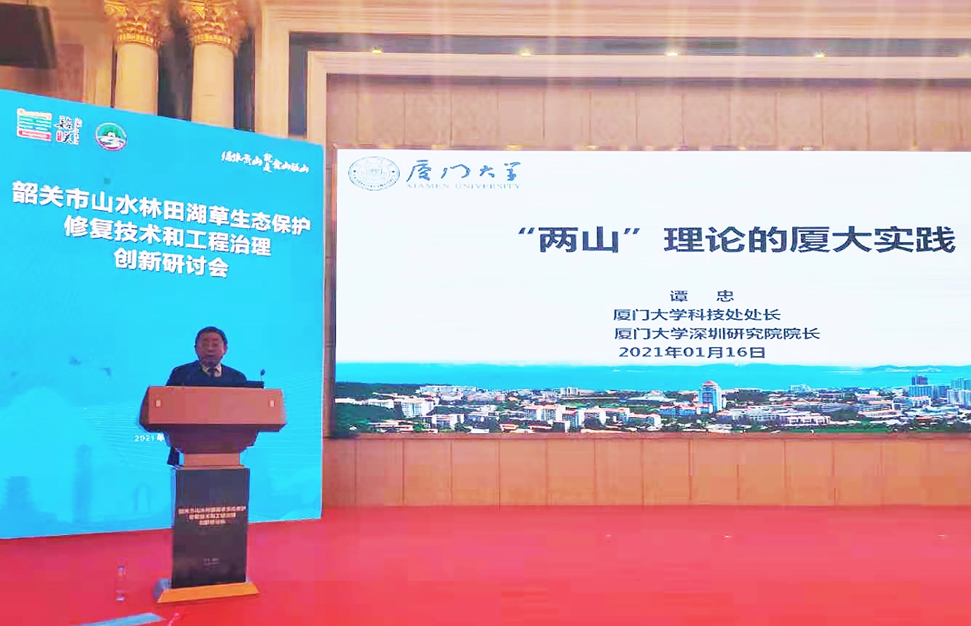 1月16日,厦门大学深圳研究院院长、校科技处处长谭忠,院办公室主任叶卫华等赴韶关参加韶关市山水林田湖草生态保护修复技术和工程治理创新研讨会,谭忠在会上做《“两山”理论的厦大实践》主题演讲。