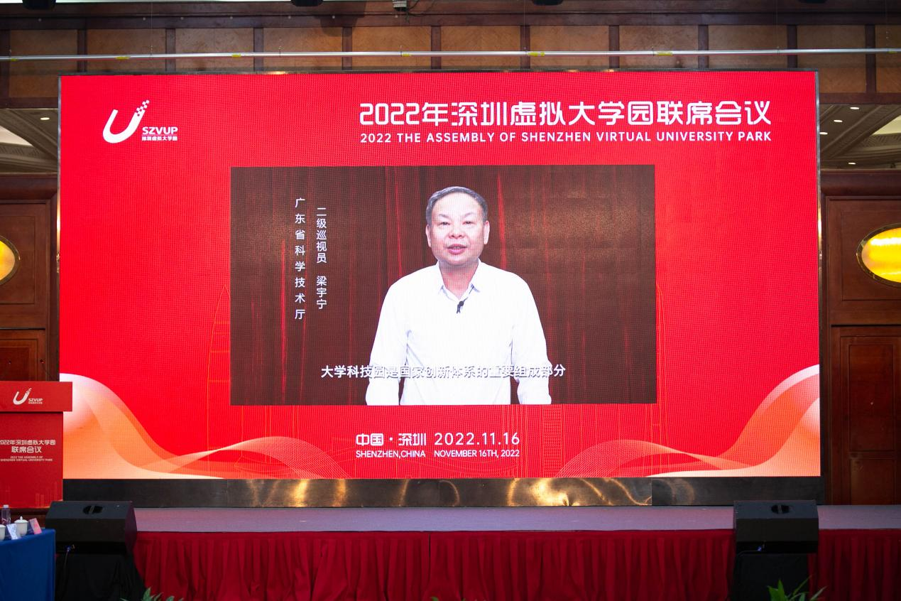 广东省科技厅二级巡视员梁宇宁同志线上致辞。他表示,此次会议是学习贯彻党的二十大精神的继续行动,为进一步推动虚拟大学园的发展,助力广东科技自立自强具有重大意义。他指出,深圳虚拟大学园是国家大型科技园和创新型产学研示范基地,扎根深圳,协同湾区,辐射全国,拓展海外,为深化市校融合、深港合作、国际交流、服务城市发展做出了突出贡献。他认为,要准确把握大学科技园新发展阶段的新任务、新要求,加强研究谋划和改革创新,全面推动大学科技园高质量发展。