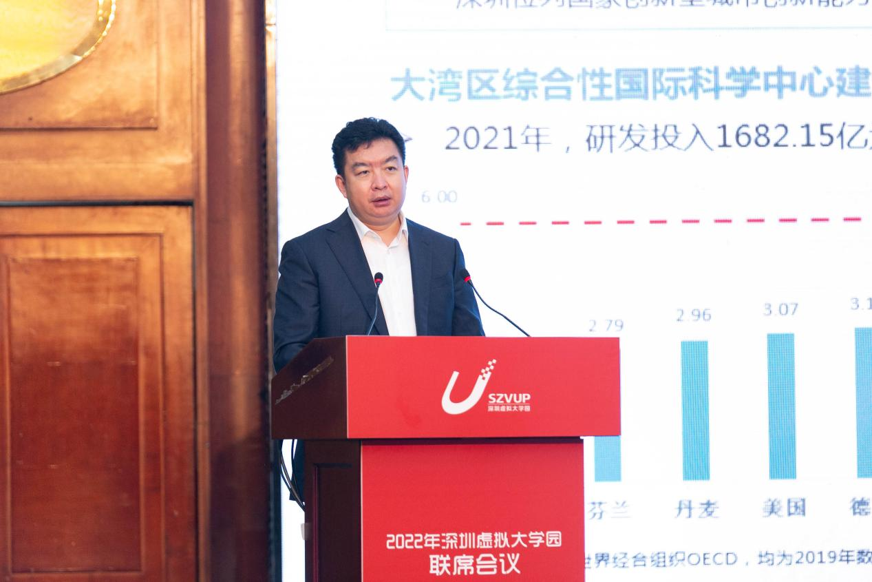 深圳市科技创新委员会党组成员、副主任娄岩峰同志以“踔厉奋发建设国际科技创新中心,蹄疾步稳打造科教融合创新高地”为题从深圳科技创新发展成就、深圳虚拟大学园工作成效、下一步发展思路和展望三方面进行报告。他指出深圳高度重视科技创新发展,并在2021年全球科技创新城市中排名第18位,全社会研发投入达到1682亿元。他表示,深圳以企业为创新主体,企业以市场需求作为创新导向,要进一步发挥有效政府和有为市场的结合效应。同时,他对厦门大学深圳研究院、对外经济贸易大学深圳研究院、中南大学深圳研究院等部分研究院的党建工作提出表扬,他希望深圳虚拟大学园各研究院在党建的引领下,做好各项工作,实现教育、科技、人才的大融合大发展。