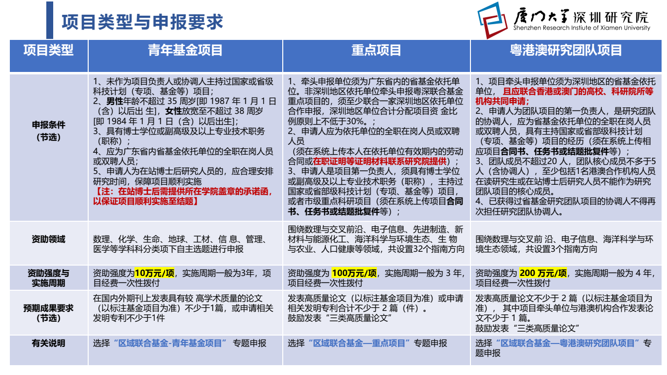 本年度广东省粤深联合基金项目均无社保限制。其中,青年基金自主选题申报,资助强度10万/项;重点项目共设置32个指南方向,围绕数理与交叉前沿、电子信息、先进制造、新材料与能源化工、海洋科学与环境生态、生物与农业、人口健康等关键领域,资助强度100万/项;粤港澳研究团队项目围绕数理交叉前沿、电子信息、海洋科学与环境生态领域共设置3个指南方向,资助强度200万/项。