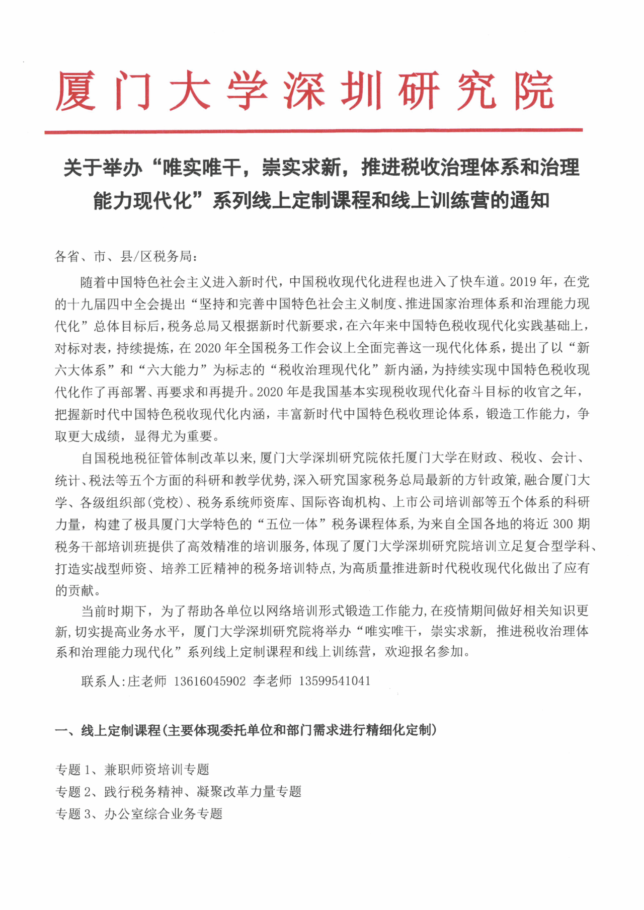 今时当下,为了帮助各税务局以网络培训形式锻造工作能力,在疫情期间能够做好相关知识更新,切实提高业务水平,厦门大学深圳研究院将举办“唯实唯干,崇实求新,推进税收治理体系和治理能力现代化”系列线上定制课程和线上训练营。