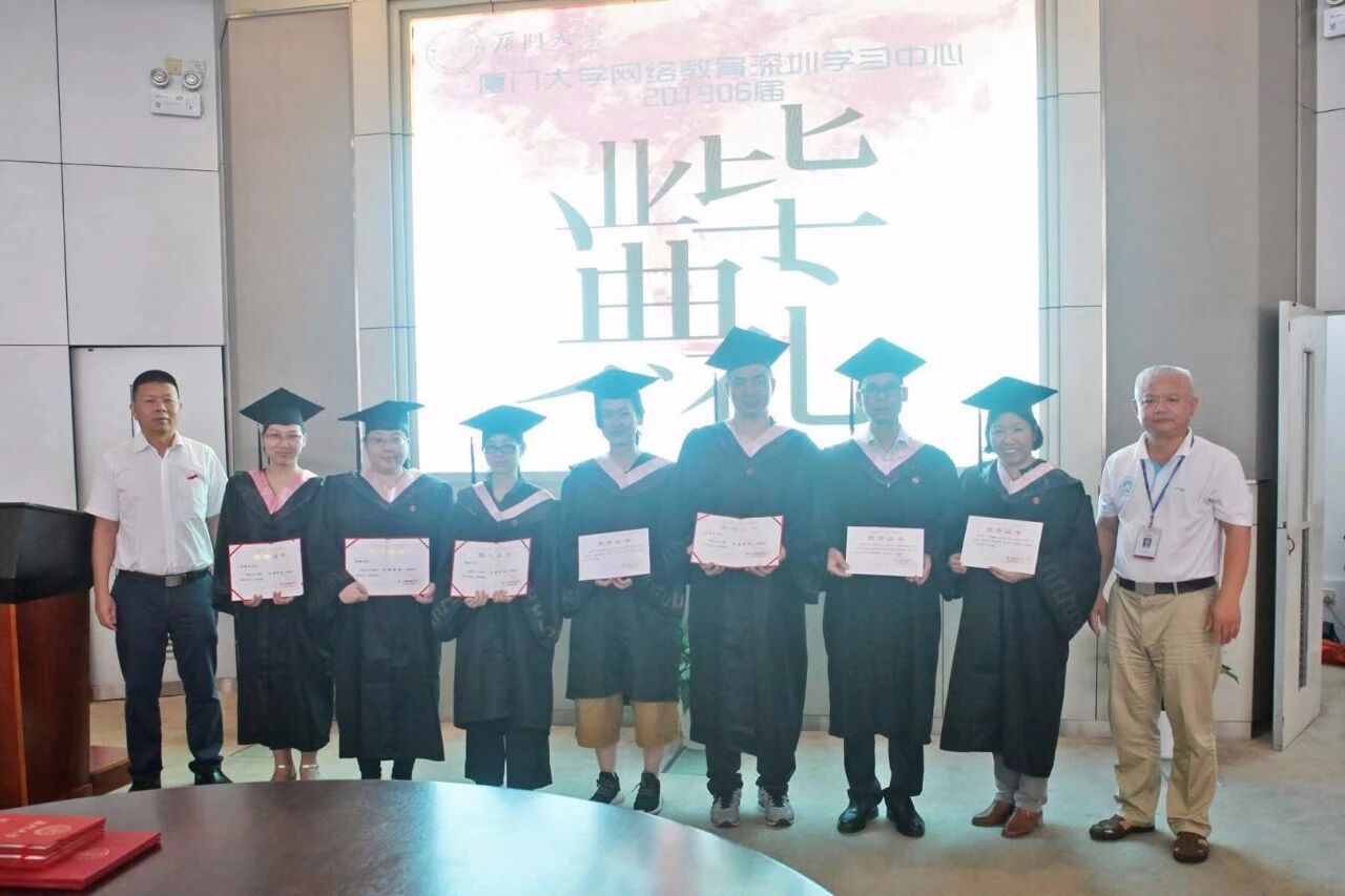 厦门大学继续教育学院党总支副书记杨鸿飞、厦门大学深圳研究院副院长郑庆喜、厦门大学继续教育学院院办公室老师洪曦,201906届毕业学子和他们亲朋好友参加了典礼。