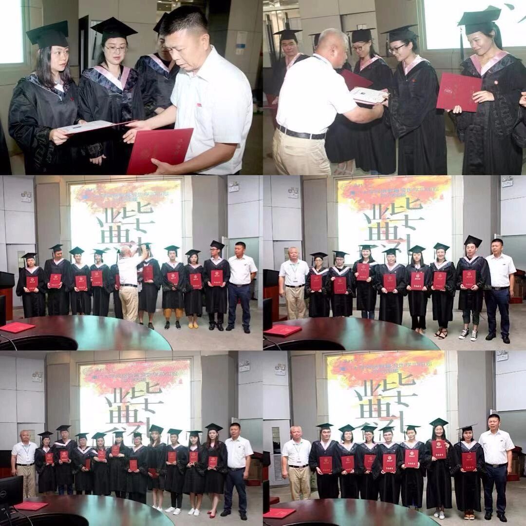 致辞结束,毕业生们分批上台参加毕业证书、学位证授予仪式,并宣读优秀学生干部、优秀学生名单;杨鸿飞、郑庆喜两位老师为他们颁发了证书。