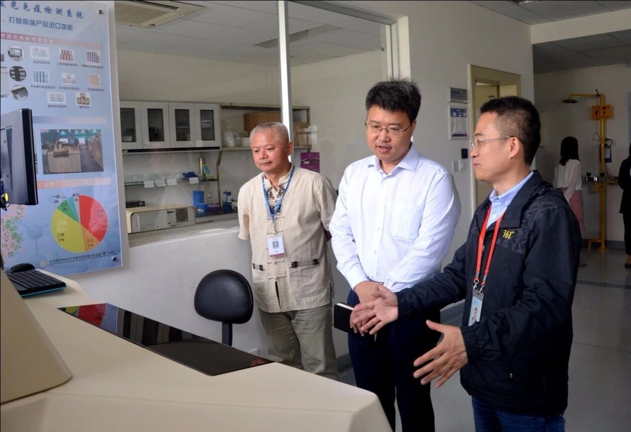 陈华平副区长等人在公共卫生学院党委副书记杨机像、林忠宁副院长、实验医学系副主任葛胜祥教授等的带领下,参观了公共卫生学院国家传染病诊断试剂与疫苗工程技术研究中心,参观后双方开展座谈交流。