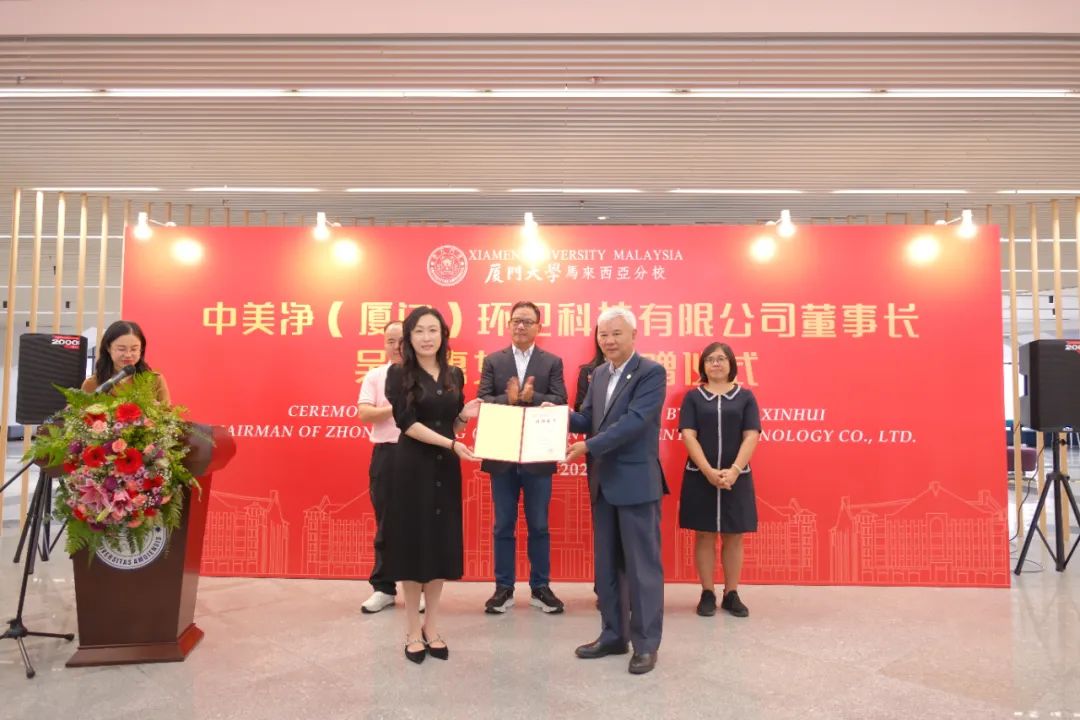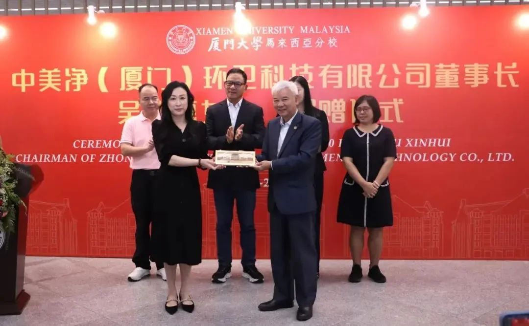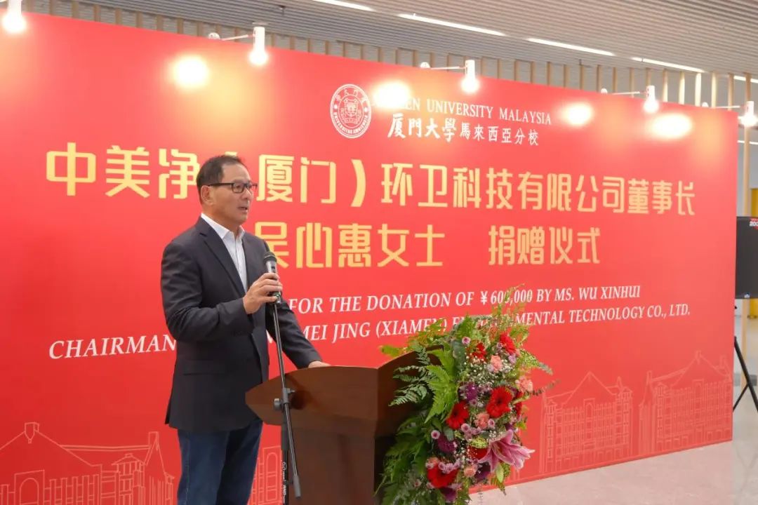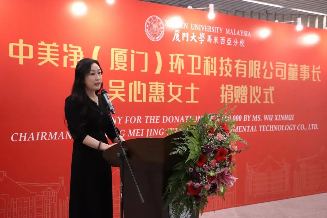 9月12日,厦门大学马来西亚分校举行厦门大学EDP校友吴心惠女士捐赠仪式。厦门大学管理学院EDP校友、福建省闽商研究会副会长、中美净(厦门)环卫科技有限公司董事长吴心惠,福建省闽商研究会会长、厦门惠龙集团有限公司董事长林文龙,看东盟领航者计划研修班班长、厦门蓝海旺集团董事长张海燕,厦门大学马来西亚分校校长王瑞芳等出席捐赠仪式。福建省闽商研究会代表、马来西亚分校相关部门负责人以及多国师生代表参加了此次活动。