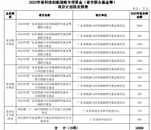 根据省级财政专项资金管理办法有关规定,拟安排2023年省市(企)联合基金、系列引才引智活动等项目15项,拟安排本年度省级财政资金10350万元。其中粤深联合基金为2000万元,海上风电联合基金为1000万元。
