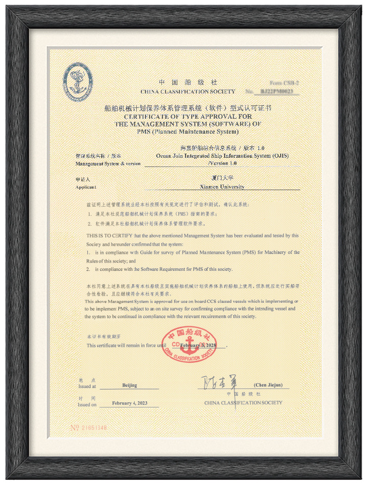 海嘉船舶综合信息系统(简称“海嘉PMS管理系统”)是由厦门大学科考船运行管理中心自主开发并获得中国船级社(CCS)型式认可证书的船舶综合信息系统。该系统针对国内船舶管理高校、公司的船舶管理特点,坚持“以人为本”的管理理念,全方位覆盖船舶管理各项业务。系统构建的数字化安全管理体系平台可有效协助船东和船舶管理单位进行船舶管理;通过数字化维修保养体系使得船舶主管机构的监督检查效率和质量更高;PMS型式认可证书是货方指定的第三方评审(如RightShip检查)机构对船舶运营提出检查清单并进行评分时必须查看的一项证书。