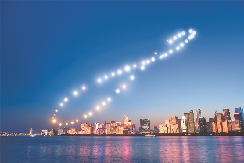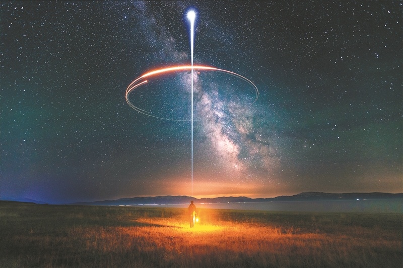 2023年5月26日,新疆赛里木湖,利用无人机光源的挪动痕迹,将绘制的图案、线条与浩瀚星河同框,呈现出梦幻与科技交织的视觉效果。卢良熙 摄