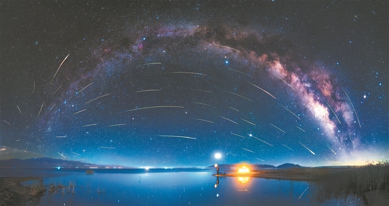 2021年8月14日,青海海西小柴旦湖的英仙座流星雨。它的成因与彗星109P/斯威夫特-塔特尔有关。每当地球穿过彗星留下的尘埃带时,微小的尘埃颗粒便会进入地球大气层并迅速燃烧,形成流星雨。瞿晓峰 摄